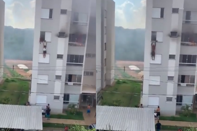Vizinhos tentaram ajudar o escape colocando colchões embaixo da janela do apartamento. O momento foi gravado e o vídeo circula pelas redes sociais. As imagens mostram um policial ajudando os moradores. (Veja abaixo)