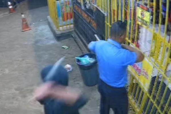 Nas imagens chocantes é possível ver um homem de casaco preto e capuz atravessando a rua e se aproximando da vítima. De repente, tira um facão da roupa e golpeia o cobrador próximo à nuca. Em seguida, foge.
