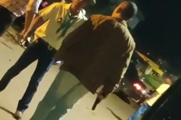 Testemunhas que estavam no local registraram a confusão. O policial à paisana identificado como sargento Ruivan de Araújo Oliveira, vestido com jaqueta bege, aparece segurando uma arma na mão e sendo contido pela mulher dele e outras pessoas da festa.