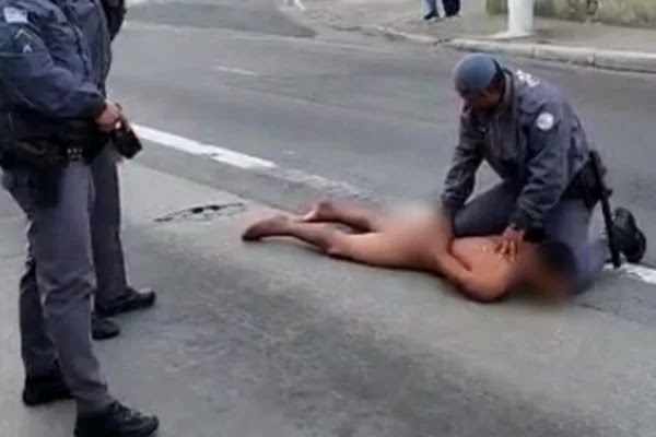 Homem pelado, que não teve a identidade informada, foi contido por policiais militares após o uso de uma arma de choque