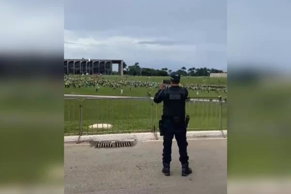 Nas imagens é possível ver o momento em que os extremistas se aproximam do gramado e invadem o órgão ao mesmo tempo em que membros da força de segurança designada para conter os protestos filmam a ação com celulares nas mãos.