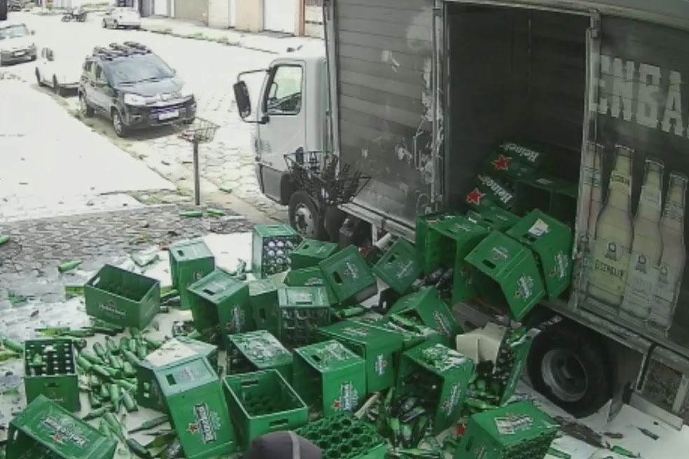 Os engradados desabam de forma descontrolada. Pelas imagens é possível ver que mais de 20 caixas de cerveja despencam do caminhão. Dezenas de garrafas quebram no chão e o líquido fica espalhado pela calçada. Segundo apurado pelo g1, apesar do susto e prejuízo com a mercadoria, ninguém ficou ferido.