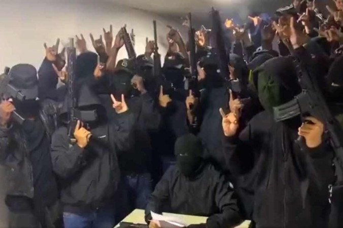 Um dos homens lê uma mensagem escrita em um papel enquanto os outros permanecem em pé. Ele afirma que fazem parte da facção Los Lobos, uma das maiores organizações criminosas do país.