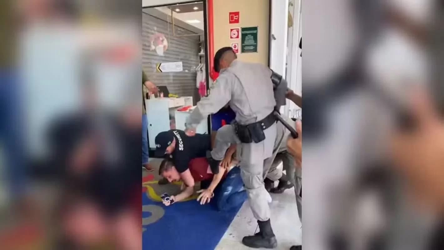 A situação aconteceu na última sexta-feira (22/12). Um vídeo mostra quando o homem é enforcado pelo segurança do shopping e leva chutes de um policial. Veja o vídeo: