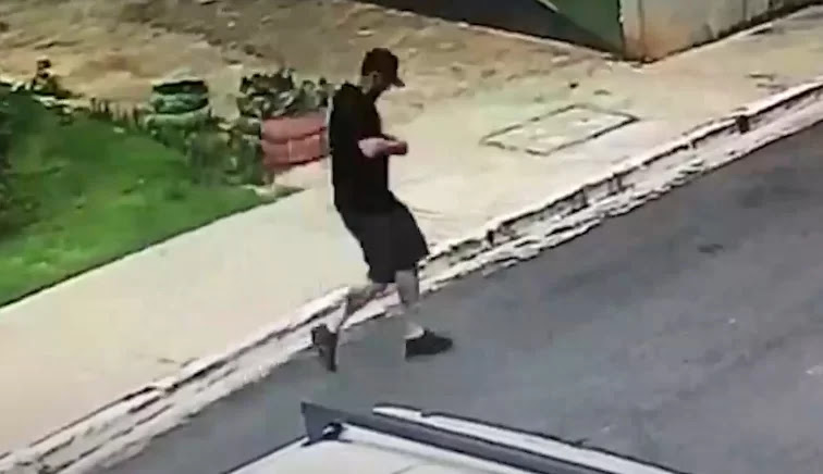 As mulheres começam a correr e são perseguidas pelo homem, que tenta destravar a pistola. Após dar a volta por trás da Kombi, o suspeito se afasta para a calçada e continua mexendo na arma. Ele balança e dá algumas batidas com a mão, sem sucesso.