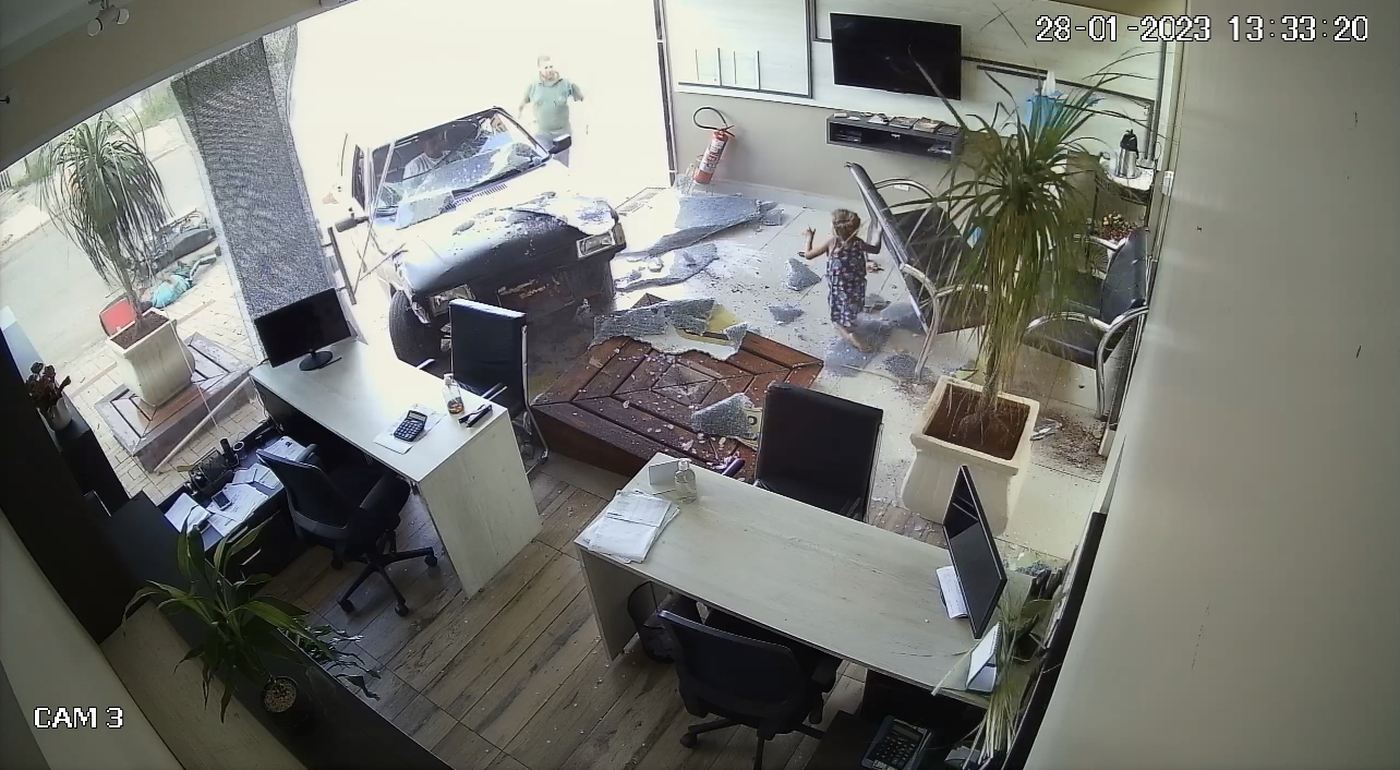 A batida foi tão forte que o veículo quebrou a porta de vidro da autoescola, atingiu um sofá e parou no meio da recepção. O carro ficou com a frente totalmente destruída.