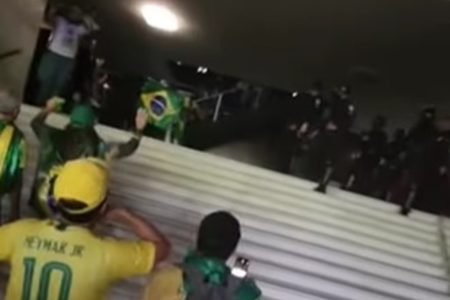 O vídeo mostra um grupo de protestantes invadirem a sede do Legislativo federal, aos gritos de “Eu sou brasileiro com muito orgulho, com muito amor”.