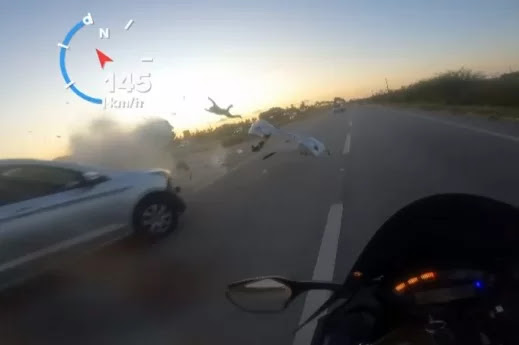 O vídeo mostra que um carro atravessou a pista, e o motociclista não conseguiu desviar do veículo. Com o impacto da colisão, a vítima foi arremessada e rodopiou no ar, antes de cair no chão.