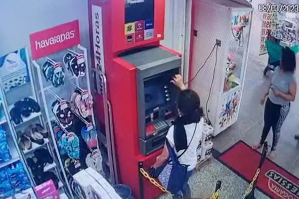 Câmeras de segurança do estabelecimento registraram o momento em que a cliente fez o saque, enquanto outras pessoas aguardam na fila. Sem esperar a operação bancária ser concluída, ela deixa o estabelecimento.