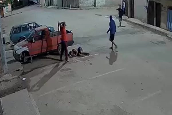 Depois disso, a vítima é arrastada até o outro lado da rua, e as agressões continuam. Alguns minutos depois, os suspeitos se afastam e a vítima tenta se levantar, mas rapidamente eles retornam e continuam golpeando o homem com um pedaço de madeira, um de mangueira e chutes.