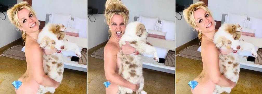 Britney Spears compartilhou fotos em que aparece nua segurando um cachorro no colo nesta quinta-feira (5).
