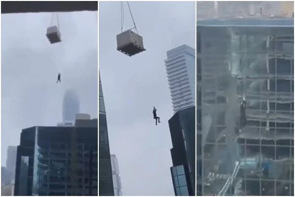 Vídeo divulgado nas redes sociais mostra o operário pendurado e pedindo ajuda. O acidente aconteceu em um canteiro de obras, e o homem, que não teve identidade revelada, aparece segurando em uma corda presa a uma palete de materiais de construção.